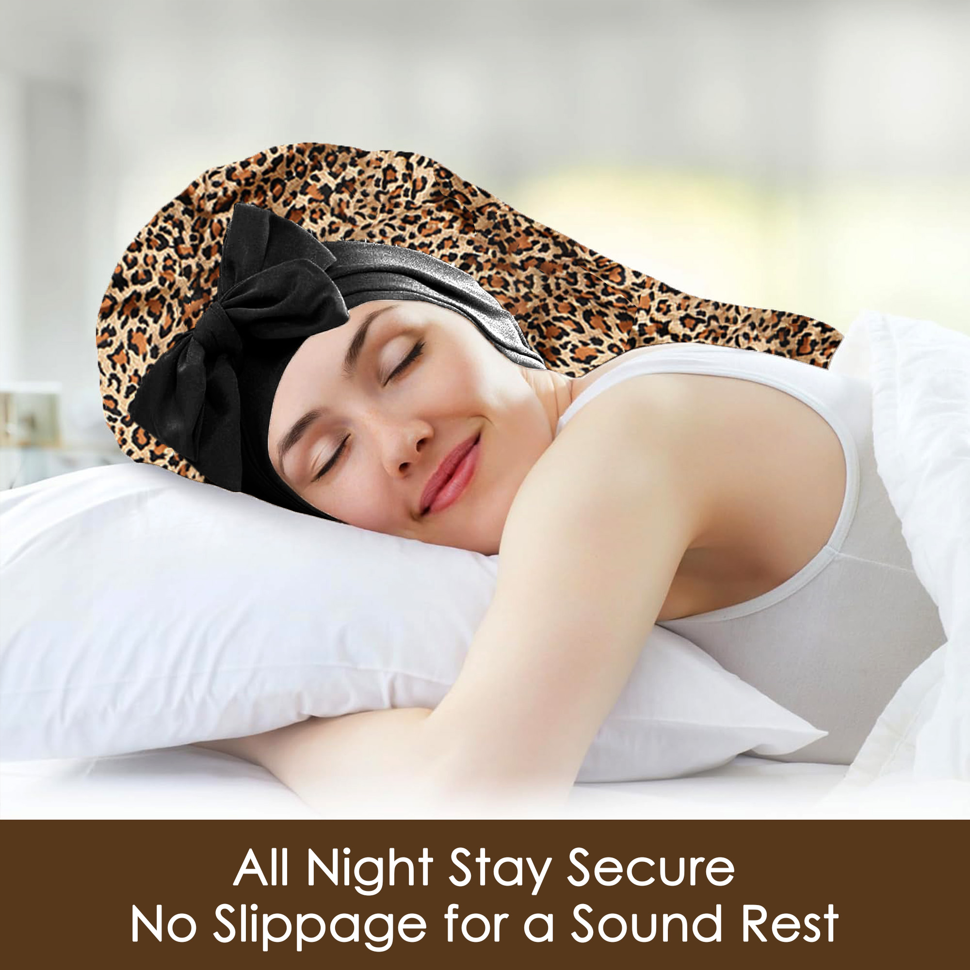 Long Satin Bonnet for Women, Double Layer Soft Silk Bonnet for Long Hair, Elastic Bonnet with Tie Band Sleep Cap (Leopard)