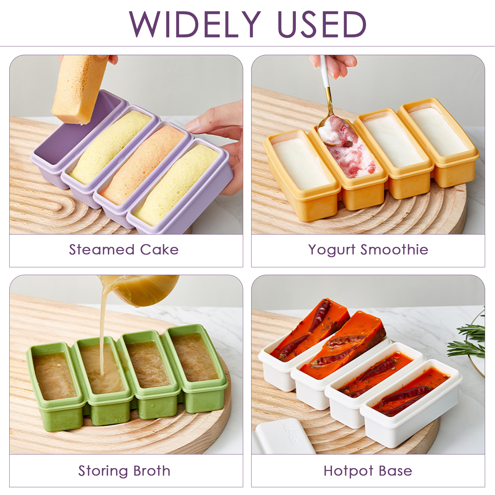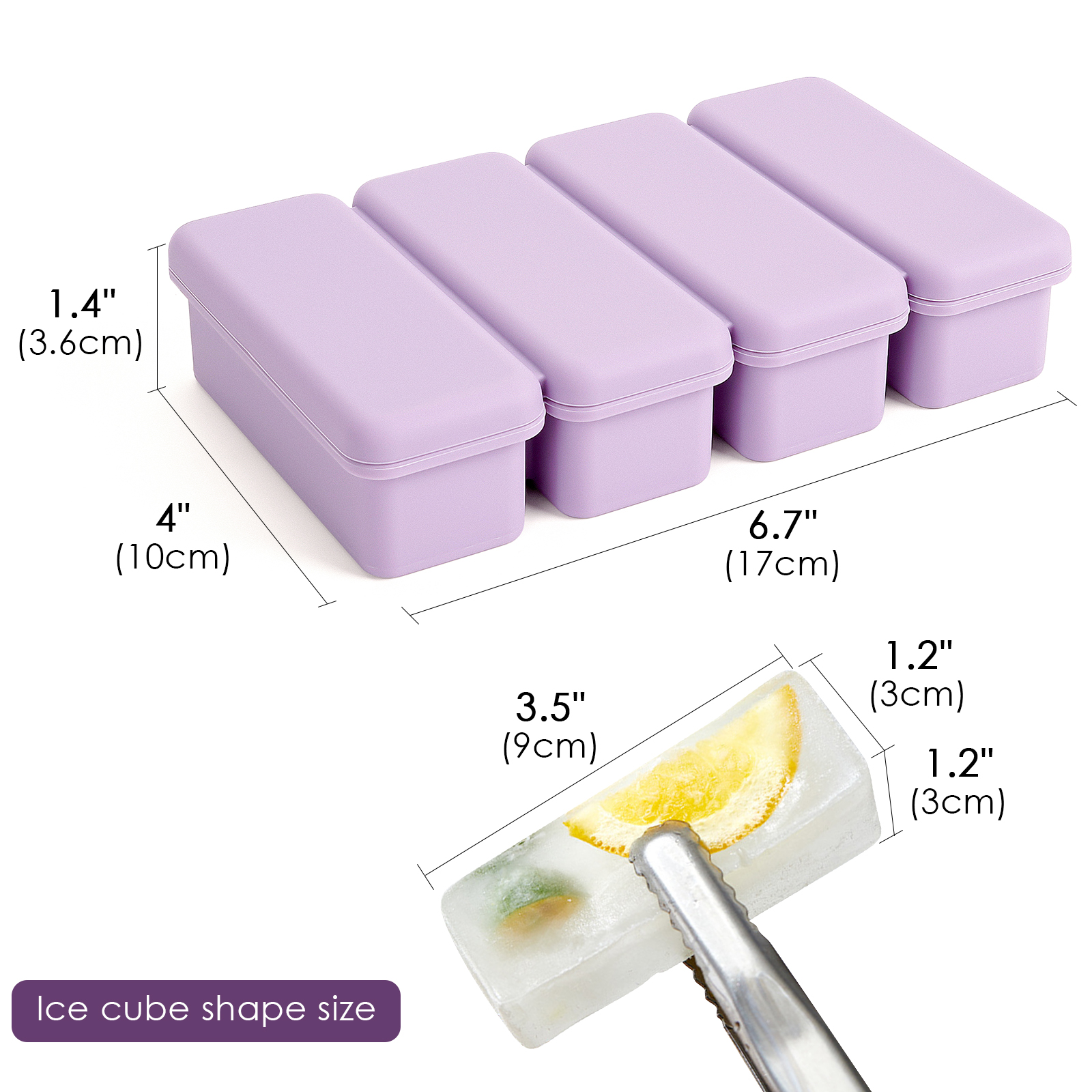 Flexible ice trays unique compartment holds 2.9 ounces, each ice brick measuring 3.5*1.2*1.2 inches.
