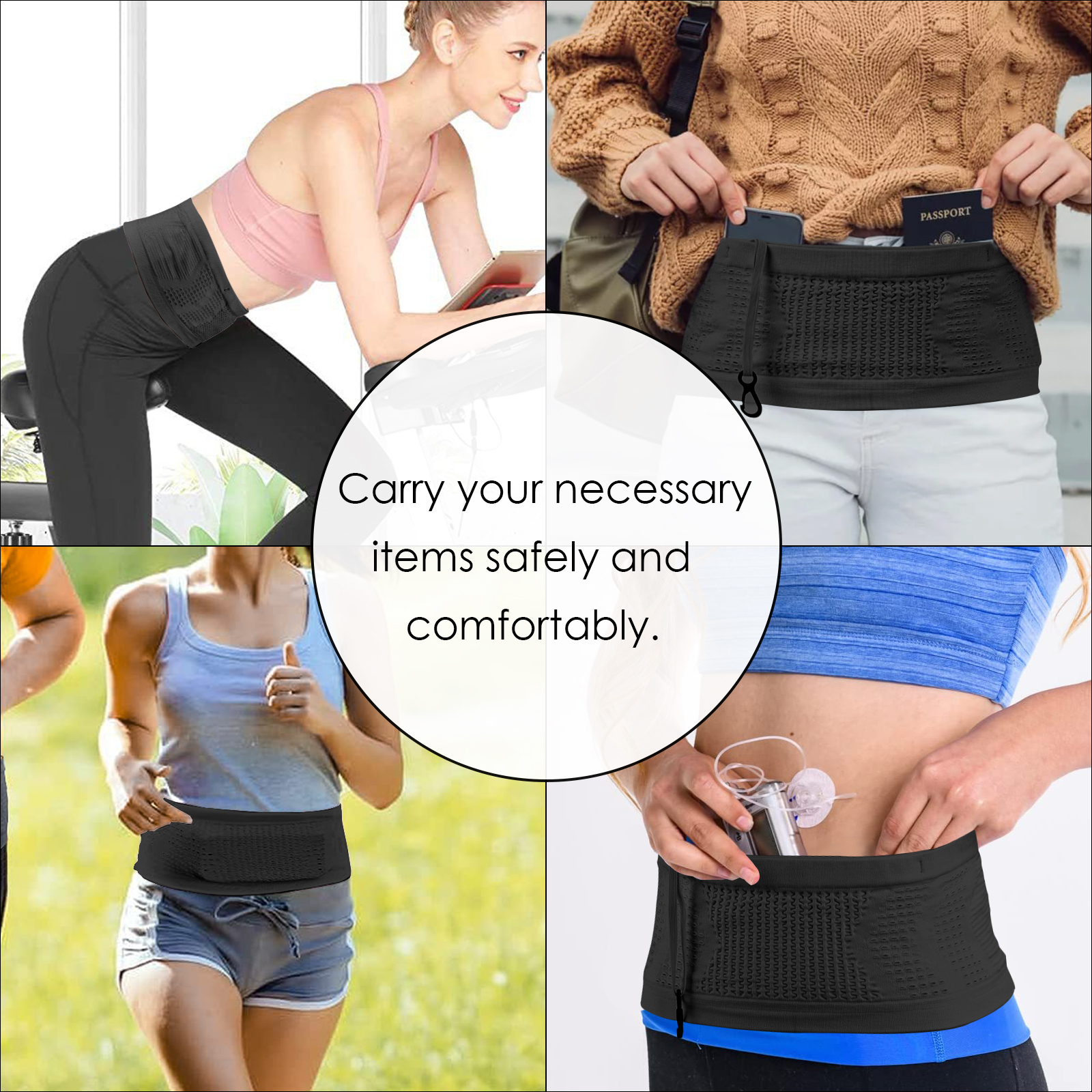 360 ring jogging belt fanny pack for holding size phone, cash, cards, identification, keys and travel necessities. With an internal key hook for added security.